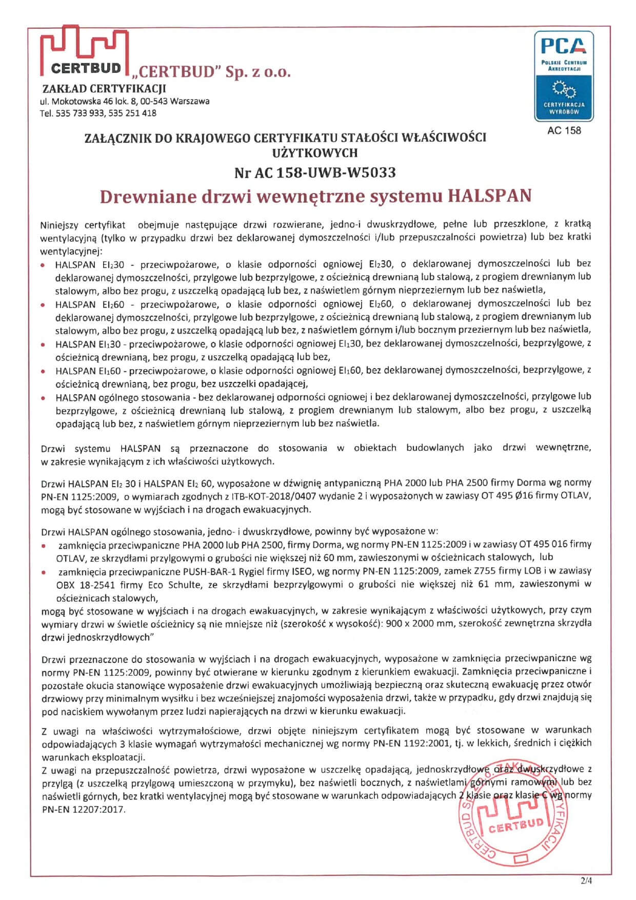 Nasze drzwi są wyrobami certyfikowanymi Krajowym Certyfikatem Stałości Właściwości Użytkowych Nr AC 158-UWB-W5033